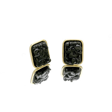 Black Jade Fu Dog Carving Cushion Earrings In 18 Kt. Yellow Gold.