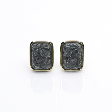 Gray Jade Fu Dog Carving Earrings In 18 Kt. Yellow Gold.